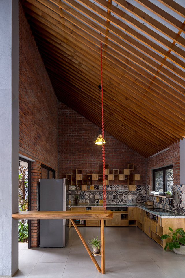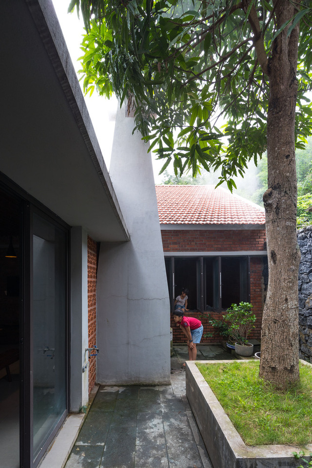 Ngôi nhà sử dụng những cửa kính lớ, mở rộng tối đa, khiến không gian trong và ngoài nhà hòa làm một, ngồi ở vị trí nào cũng có thể thấy sân, cây to với tường đá xám bao quanh. Ngôi nhà gợi nhớ đến những ngôi nhà cổ kính với những mái ngói rêu phong, những bức tường xám nhòa theo thời gian. Sự hài hòa được tạo nên bởi những viên gạch thô, những viên đá thô ráp lấp ló dưới những lùm cây xanh, ngôi nhà mang một hơi thở rất nhẹ của màu thời gian, của sự bình yên và cả sự gắn kết.