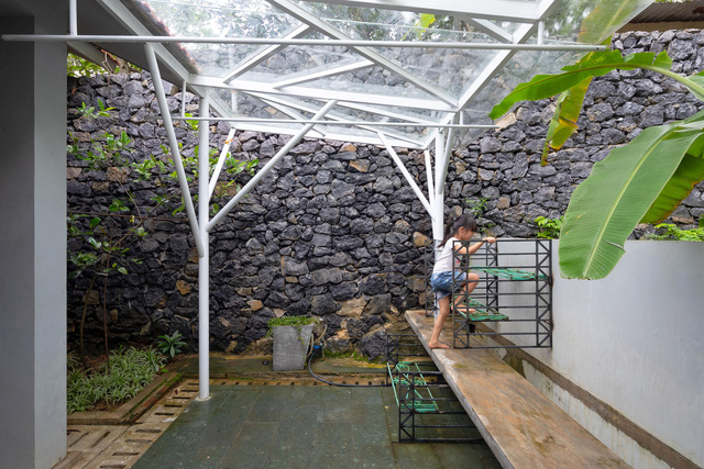 Hai bên ngôi nhà là tường rào xây bằng đá đen sẫm, đá được lấy trong quá trình đào móng cột công trình và san lấp sân. Bức tường đen xám rất mộc mạc, gợi nhớ đến những bức tường đá của người dân tộc vùng núi nơi hai vợ chồng sinh sống. Toàn bộ ngôi nhà được xây bằng gạch đỏ không trát, mái lợp ngói đỏ, loại ngói thường được dùng ở vùng quê Bắc Bộ